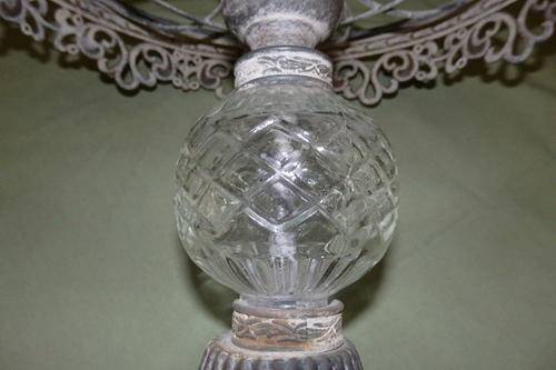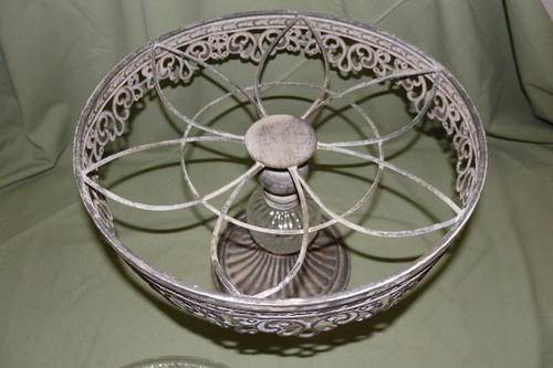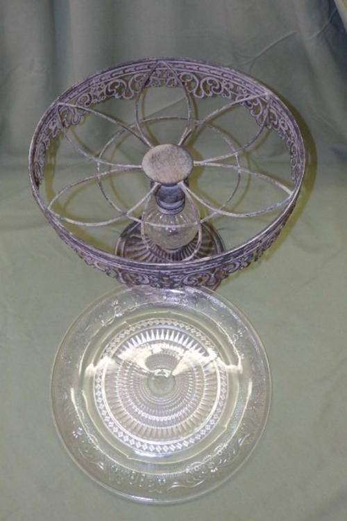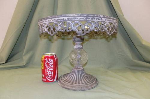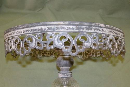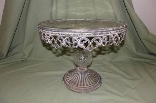 THIS INCREDIBLE "FOOTED" METAL CAKE/ PASTRY STAND WITH A BEAUTIFUL DETAILED GLASS PLATE AND LACE WORK AROUND THE STAND HAS A WONDERFUL VINTAGE/ ANTIQUE LOOK PAINT TECHNIQUE. THE CAKE STAND MEASURES A VERY DECENT 30cm ACROSS AND IS 25cm TALL. THERE ARE NO CHIPS OR CRACKS IN THE REMOVABLE GLASS PLATE. THE STEM OF THE STAND ALSO HAS A ROUND GLASS BAUBLE. THIS IS A STUNNING PIECE AND WOULD BE IDEAL FOR TARTS, MUFFINS AND SCONES TOO.