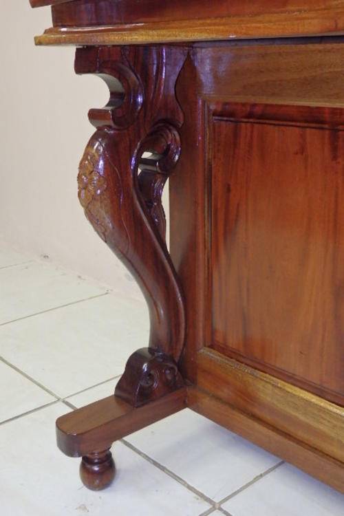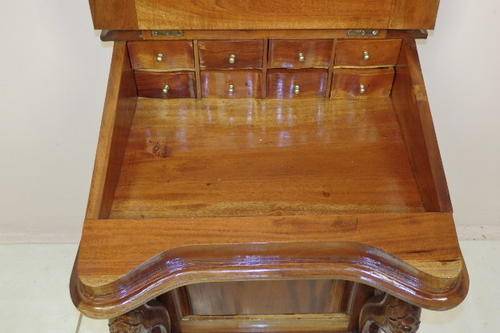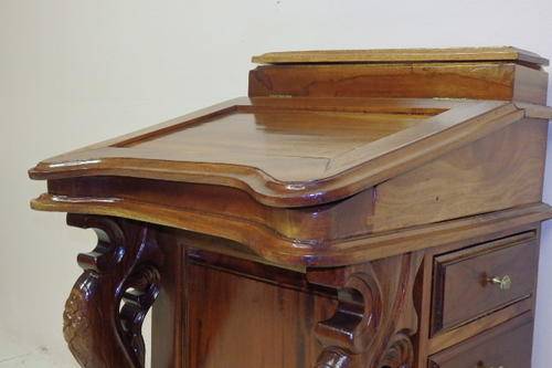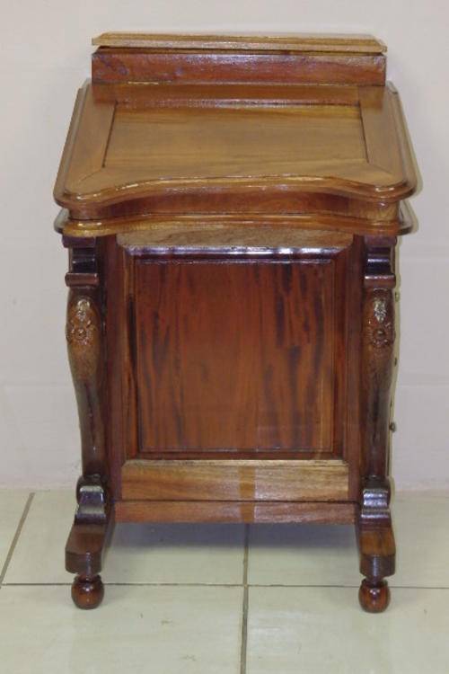THIS EXTREMELY BEAUTIFUL CARVED AND SOLIDLY BUILT VINTAGE SHIP CAPTAIN'S DESK / DAVENPORT IS ABSOLUTELY AWESOME AND IN EXCELLENT CONDITION FOR IT'S AGE!!! THIS IS REALLY EXQUISITE TOP QUALITY FURNITURE! THE SIZE OF THE DAVENPORT IS APPROXIMATELY 535mm x 575mm x 865mm HIGH. THE DAVENPORT HAS FOUR DRAWERS ON THE ONE SIDE AND EIGHT PIGEON HOLE DRAWERS IN THE DESK, AS WELL AS A COMPARTMENT ON TOP OF THE DAVENPORT. THESE DESKS ARE VERY RARE!!!