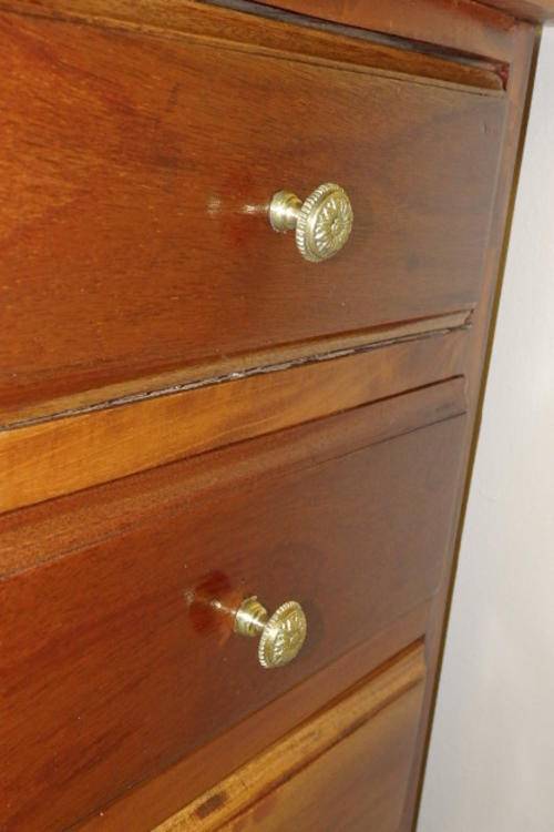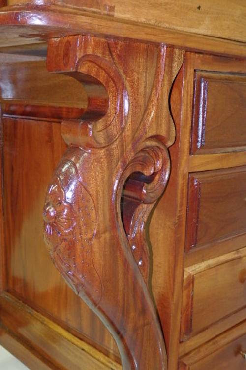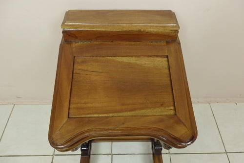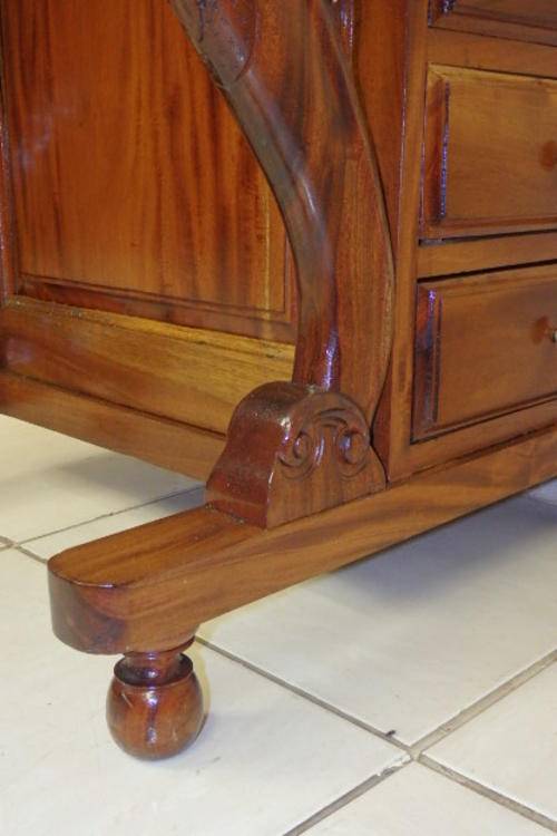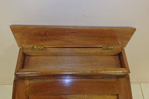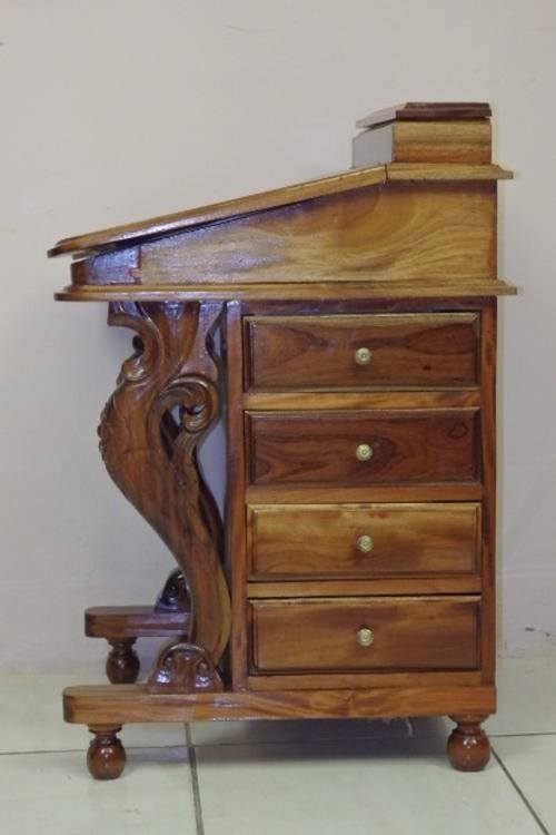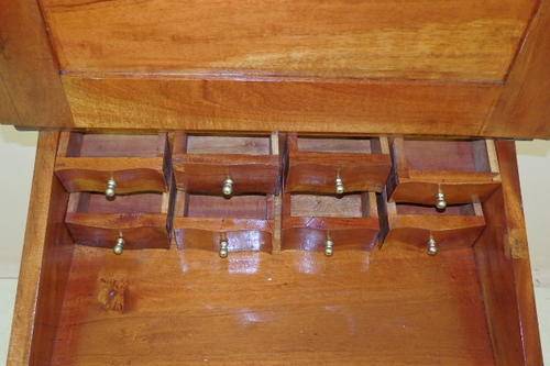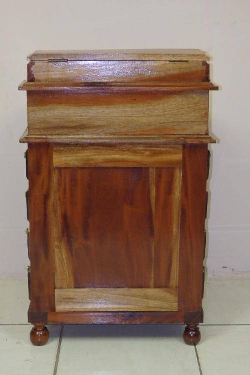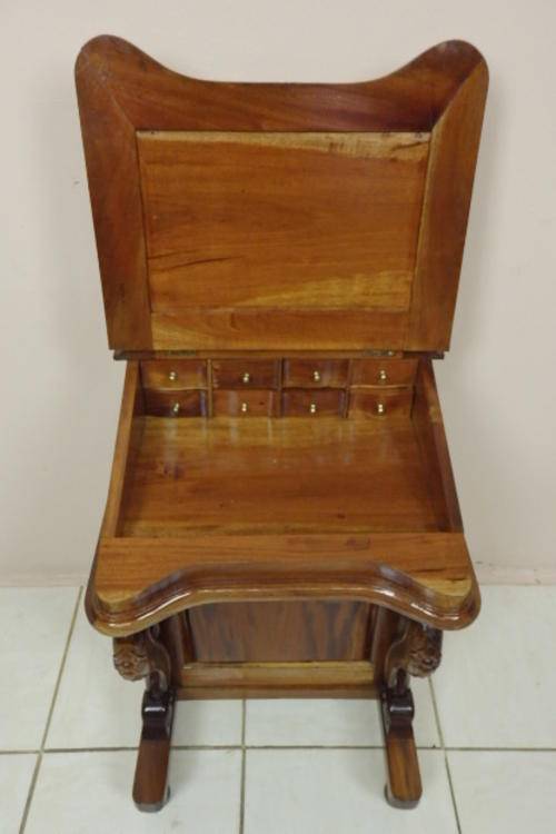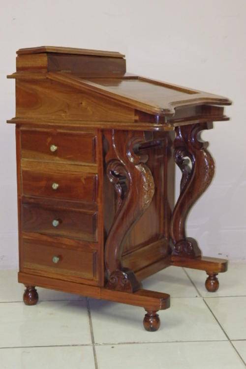 Definition: A type of small case desk, with a slanted and/or pull-out top and a row of drawers down one or both sides; some have one side of working drawers and one side of faux drawers. Many also have small front drawers, cubbyholes, hidden compartments or pop-up galleries.