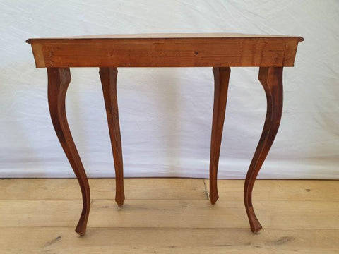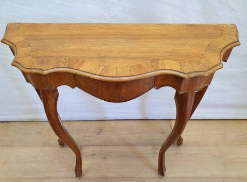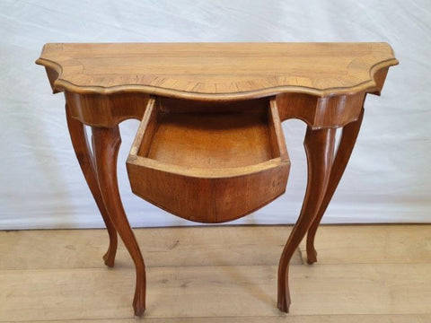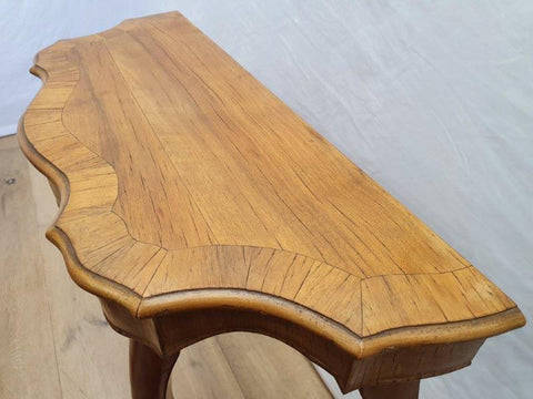 This gorgeous vintage Indonesian Teak half moon table with a scalloped edge and single drawer is in good condition for its age and would look stunning in an entrance or hallway for that special piece you want on display. The size of the table is approximately 80cm long x 30cm wide x 75cm high. There is normal age and usage related wear and scuffs on this table. Please view the pics carefully to fully appreciate this stunning half moon table and to confirm the condition