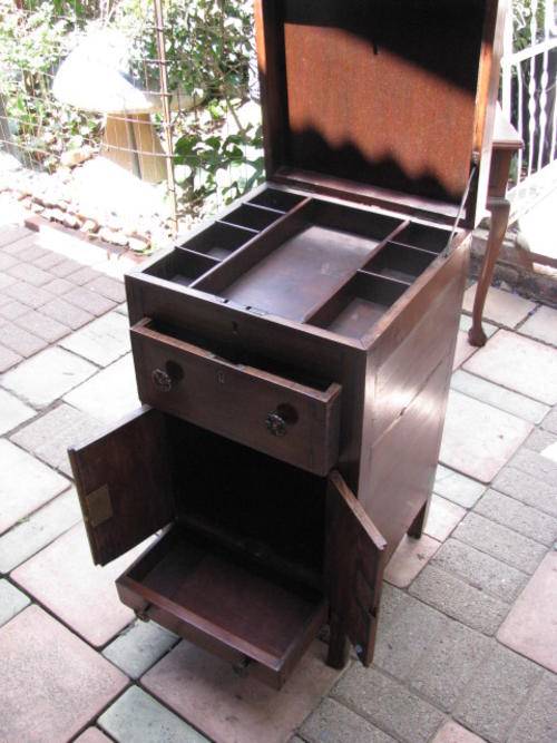 IT HAS A FLIP TOP WHICH WOULD HAVE CONTAINED SOAPS, LOTIONS, COTTON WOOL. CLOTHS ETC