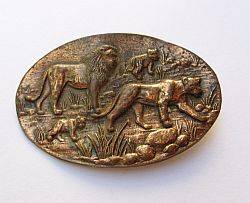 A real vintage old South Africa brooch made of copper and if you can trace the registration number I am sure you will find that the very detailed lion family design was commissioned by a well known designer .