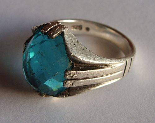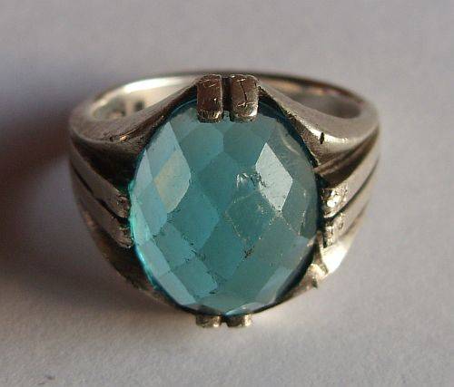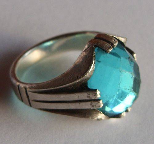 A perfect pinky ring . Sterling silver set with an unusually faceted blue stone or glass . Some surface chipping to stone , can be polished away .