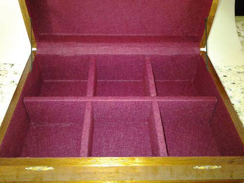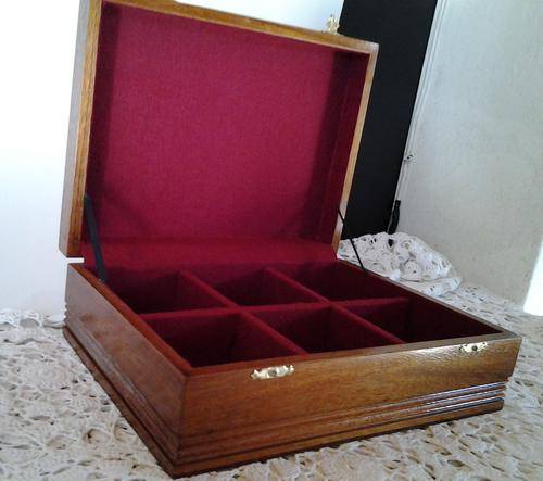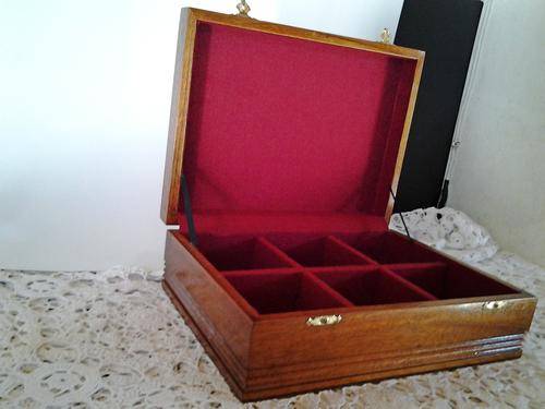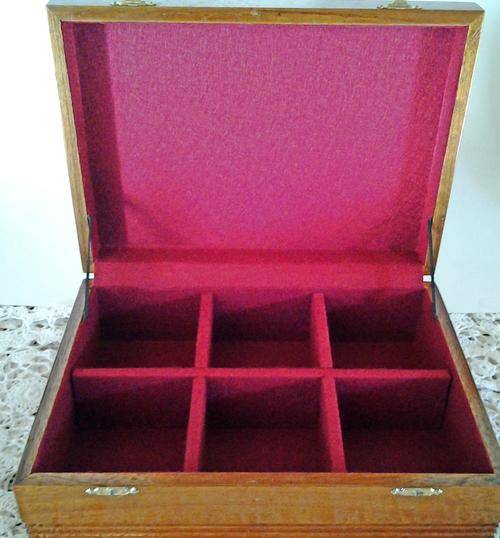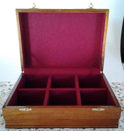 The wooden box has 6 compartments and can be used for many things. A tea box, a jewellery box, to store valuables etc.