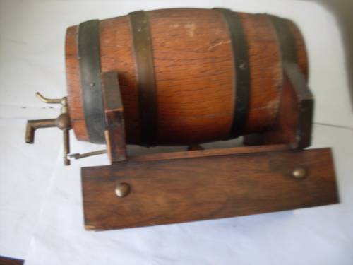 AN OLD VINTAGE WOODEN/BRASS BARREL ON STAND