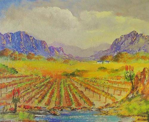 AN ORIGINAL LOUIS PRETORIUS:Boland Farm with vineyard (620mm x 500mm x 20mm)