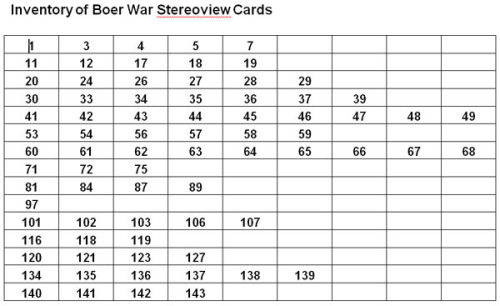 The Boer War cards in the series from Underwood have caption which describe the photograph. All are numbered and an inventory of those that are for sale by number is in the images. A selection of sixteen cards (one side only) is in the images. All the cards from old Durban are in the images.