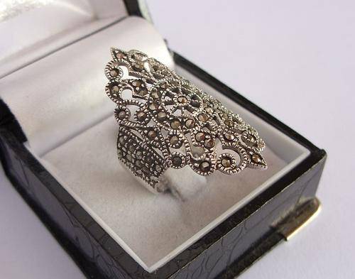 AN OUT OF THIS WORLD BIG STERLING SILVER RING WITH TONS OF DETAIL AND MARCASITE !!!! WOW , WOW !!!!