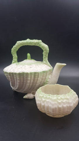 This exceptionally rare antique Belleek of Ireland hand painted fine porcelain teapot and sugar bowl set in the Neptune Green range is an insanely rare find and only a hand full of these antique Belleek pieces are available around the world. There are no chips or cracks in either the teapot and lid and there has been a mend on the sugar bowl. The Neptune range was manufactured in green, white, pink and yellow. The black stamp at the base confirms this set is a first series and was made between 1891 and 1926. The teapot measures 17.5cm long including the spout x 15cm wide x 16cm high and the sugar bowl measures 9cm across x 5cm high.