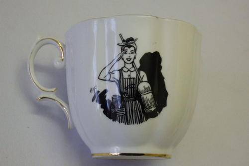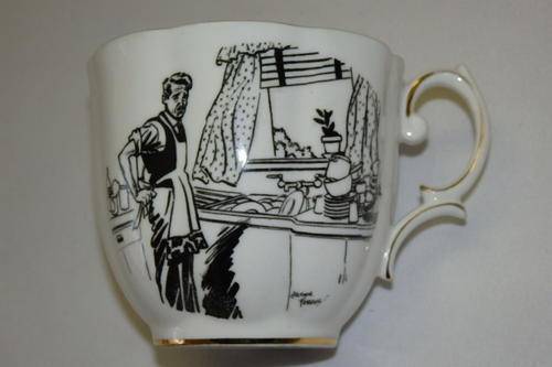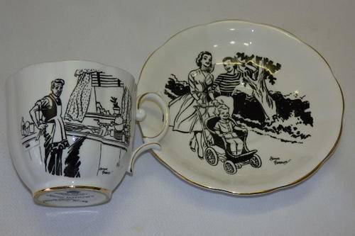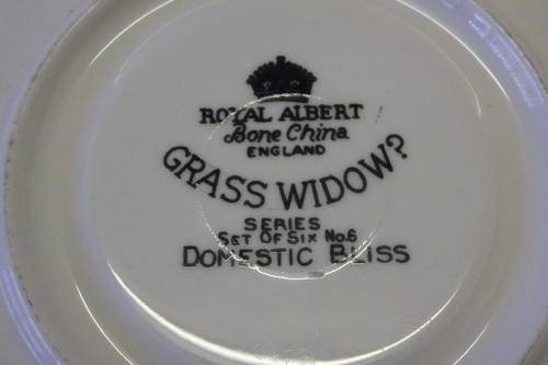 THIS UNBELIEVABLE AWESOME VINTAGE (1950's) ROYAL ALBERT "BLACK AND WHITE" "GRASS WIDOW" "DOMESTIC BLISS" LIMITED SERIES CUP & SAUCER DUO IS ONE OF ONLY SIX PATTERNS BY ARTIST ARTHUR FERRIER (1891 TO 1973) IN THIS SERIES. THE GRASS WIDOW SERIES INCLUDES "GOLF, FISHING, BATHING, SKATING, YACHTING, AND DOMESTIC BLISS". THE SHAPE IS THE FLUTED COUNTESS. THE SERIES WAS ONLY MANUFACTURED IN THE 1950's. THE DUO IS IN PRISTINE CONDITION.