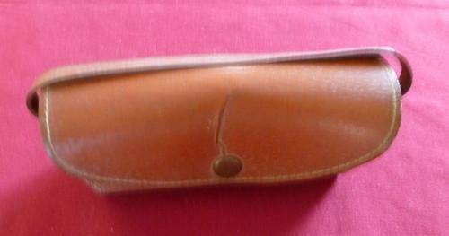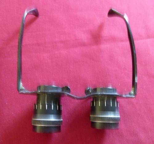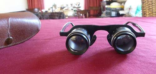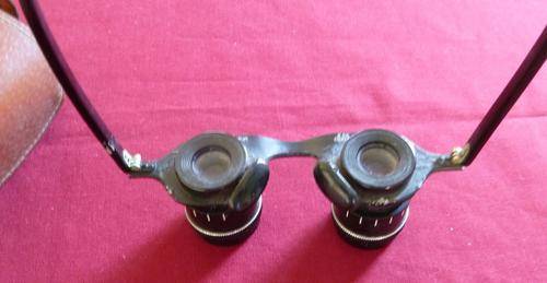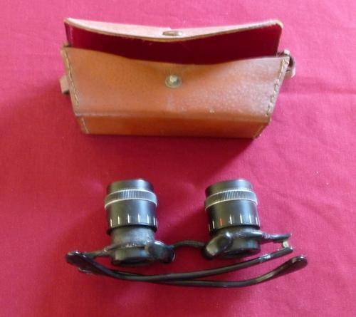 An unusual pair of wear able opera glasses in their original leather carry case. The glasses have focus adjustors and appear to be in good working order. They are marked Carton, and 2.5x coated. The leather case is marked Japan. There is a small crease on the lid of the leather case, but it still opened and closes well.