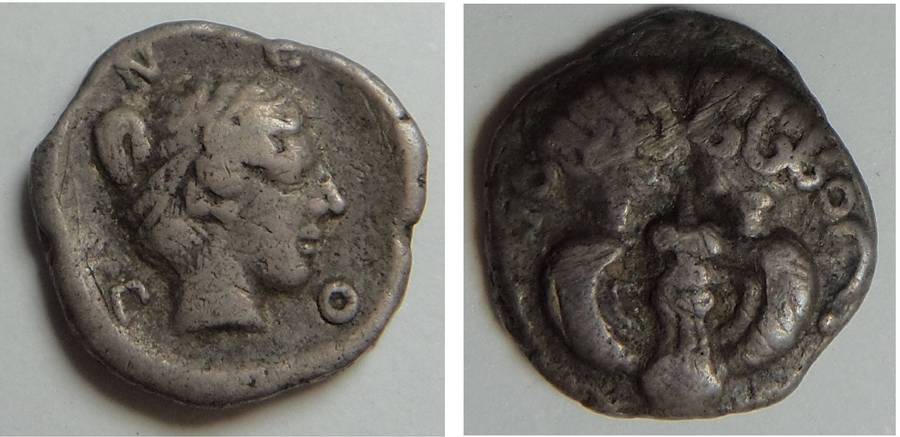 Head of the nymph of Neapolis facing to right, her hair coiled around her head and with a bun at the back.