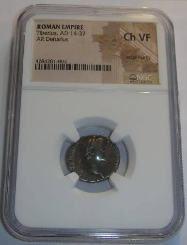 ANCIENT ROME : The Silver Tribute Penny of the Bible (Emperor Tiberius 14-37 AD) : NGC graded Choice VF