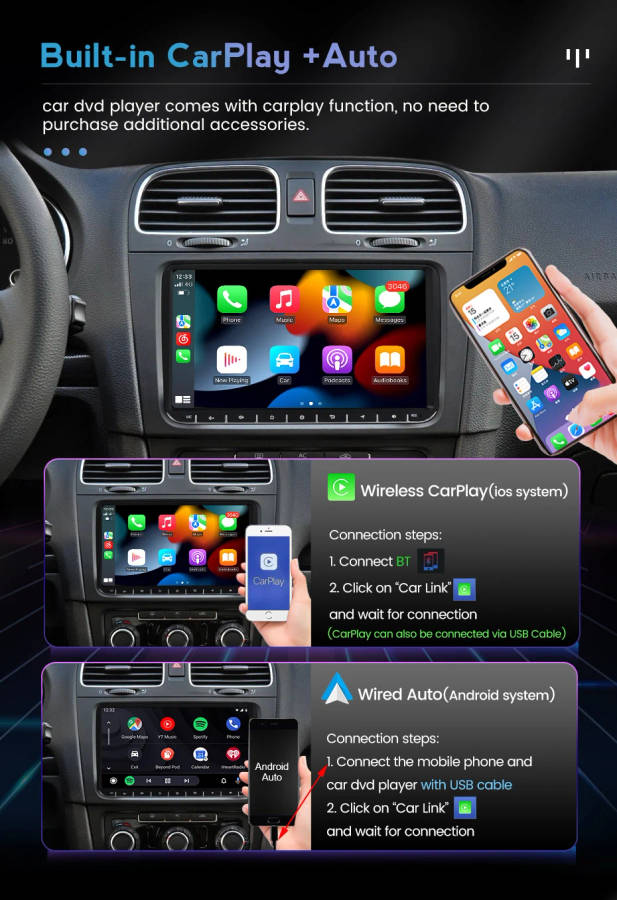 >Built-in Carplay + Auto car dvd player comes with carplay function, no need to purchase additional accessories.