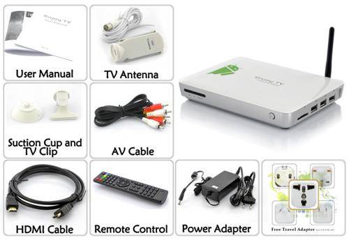 In addition, you can use the remote control to record and pause your favorite digital TV programs, so that you can watch them any time and then download them to your 4GB of internal memory or on to your own 3TB external hard drive easily connected though a USB ports on the Android TV box. Also with an array of ports and TV connections including HDMI OUT and AV OUT for connecting your choice of TV set and 3 USB IN ports for your wireless mouse and keyboard as well as a external HD, ease of setup and use is a snap.