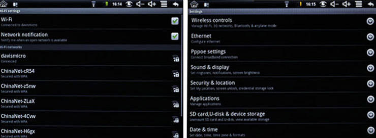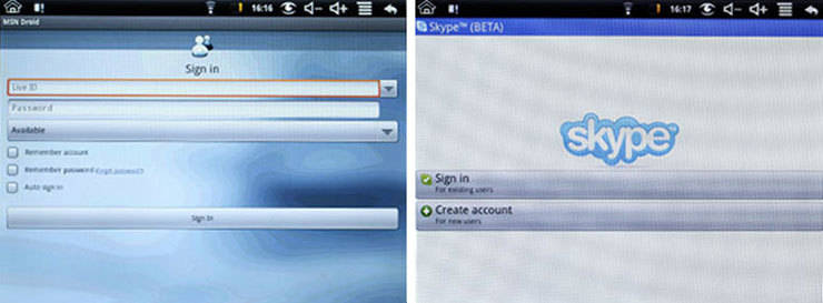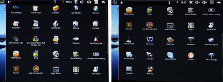 Other application: Browser, iReader, My music, My video, Gallery, File Brpwser, Settings, Wifi settings, PK Manager, Maps, Camcorder, Email, fring, Skype(BETA), AnFetion, MSN Droid, QQ, ADSL settings, Alarm Clock, App Market, Calculator, Calendar, Contacts, Gravity sensor setting, Document to go, FarmFrenzyLite, Genial Writing, Livo Reader Pro, Magic Album, Music Lite, Tudou, YouTube