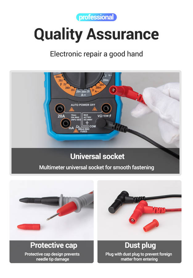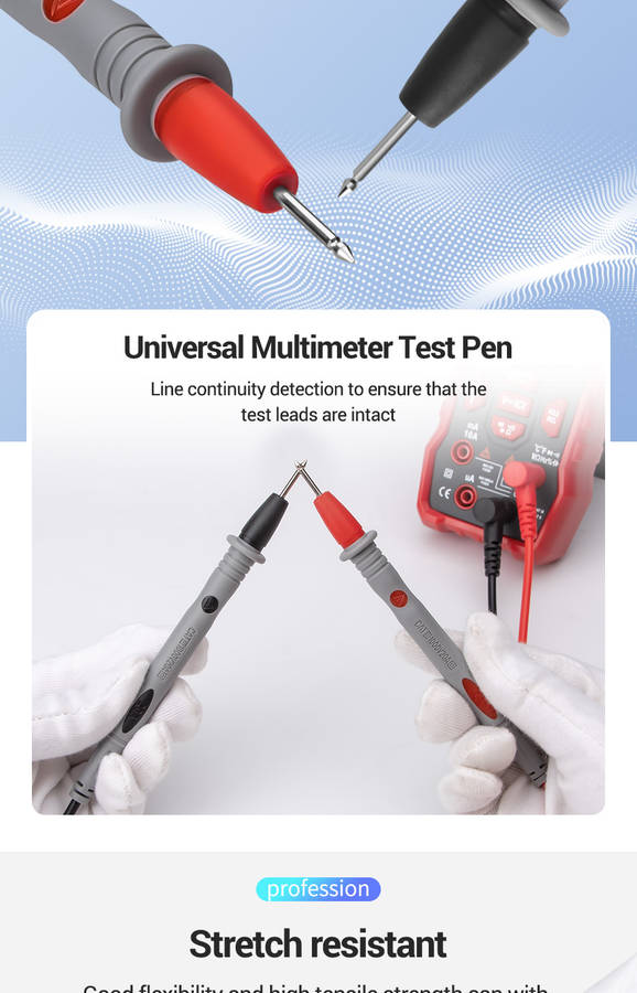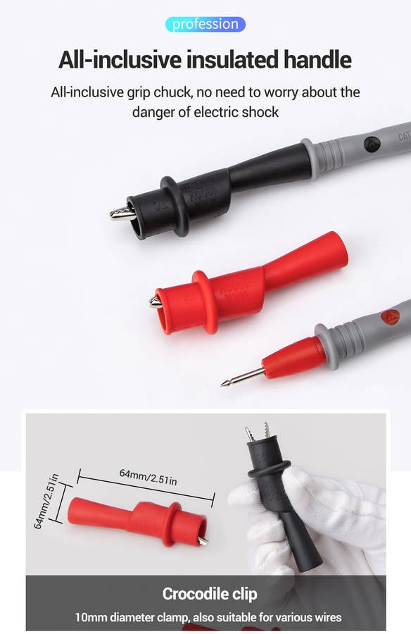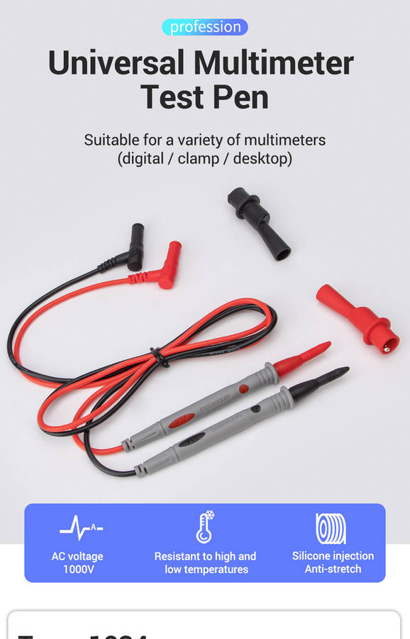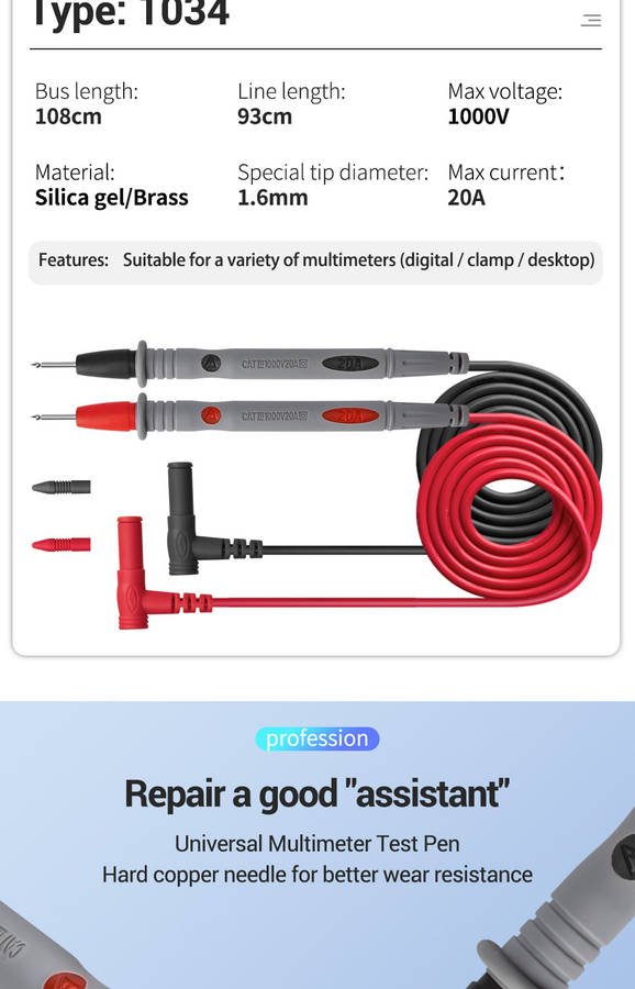 aFeatures: Suitable for a variety of multimeters(digital/clamp/desktop) a Specification: Bus length : 108CM line length : 93CM Max voltage: 1000V Max current: 20A Material: Silica gel/brass Special tip diameter: 1.6MM Package includes: 1 Pair Multimeter Test Line 1 PairCrocodile Test Clamp