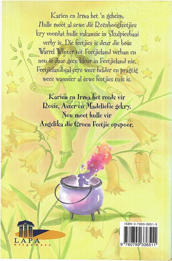 Karien en Irma het 'n geheim. Hulle moet al sewe die Reenboogfeetjies kry voordat hulle vakansie in Skulpiesbaai verby is. Die feetjies is deur die bose Warrel Winter uit Feetjieland verban en nou is daar geen kleur in Feetjieland nie. Feetjieland sal eers weer helder en pragtig wees wanneer al sewe feetjies tuis is. Karien en Irma het reeds vir Rosie, Aster en Madeliefie gekry. Nou moet hulle vir Angelika die Groen Feetjie opspoor.