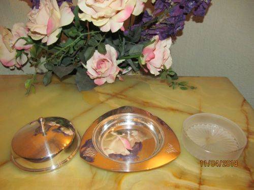 A UNIQUELY ART DECO STYLED VINTAGE SILVER PLATED BUTTER DISH MANUFACTURED BY ANGORA SILVER PLATE Co IN SHEFFIELD, ENGLAND. THIS LOVELY ITEM IS MANUFACTURED FROM SILVER PLATED NICKEL SILVER WITH A REMOVABLE FROSTED GLASS DISH DISPLAYING A LARGE STARBURST PATTERN UNDERNEATH. THE LID IS MILDLY DOMED AND TOPPED BY A FINIAL DESIGNED TO MATCH THE GENTLE TRIANGULAR SHAPE OF THE DISH. EACH OF THE THREE CORNERS ARE DECORATED WITH AN ETCHED LINEAR PATTERN IN LOOPS, ADDING TO THIS GORGEOUS ITEMS DECO APPEARANCE