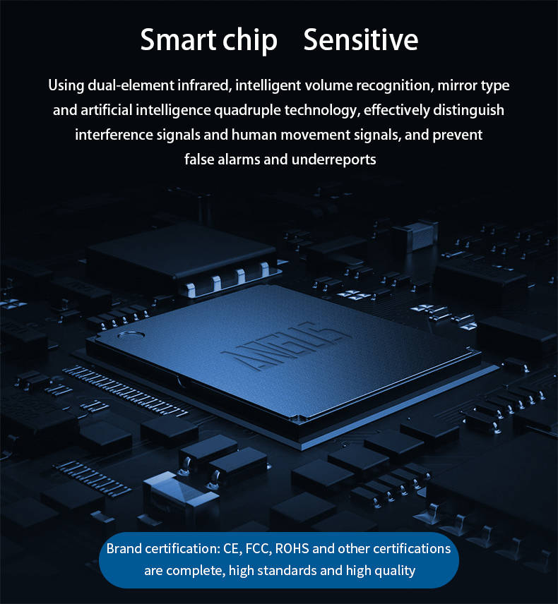 1. Dual-element infrared + intelligent volume recognition + mirror type + artificial intelligence quadruple technology; 2. Adopt intelligent identification technology, 30ua standby, battery up to 3 months without changing the battery; 3. Double lens, double temperature compensation technology; 4. Adopting mirror-type detection technology: effectively overcome the traditional shortcomings of detectors sneaking and crawling without warning; 5. Fresnel optical lens effectively prevents false alarms and false negatives; 6. Detection distance: 12m@25a 7. Detection angle: 110 degrees; 8. Anti-white light intensity 10000Lux; 9. Pet-proof 25KG; 10. FIFI standard IEEE802.11b/g/n wireless standard; 11. Alarm output: WiFi transmission alarm;