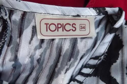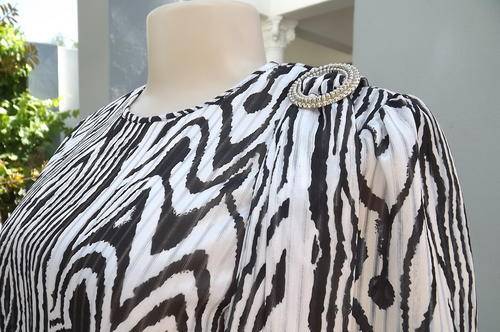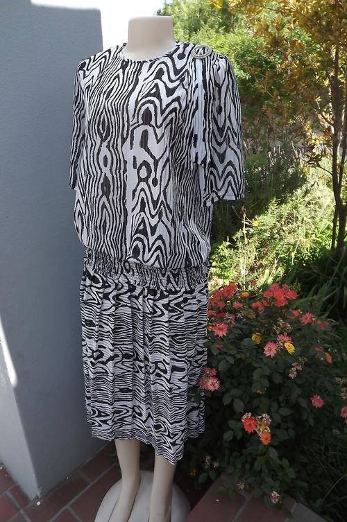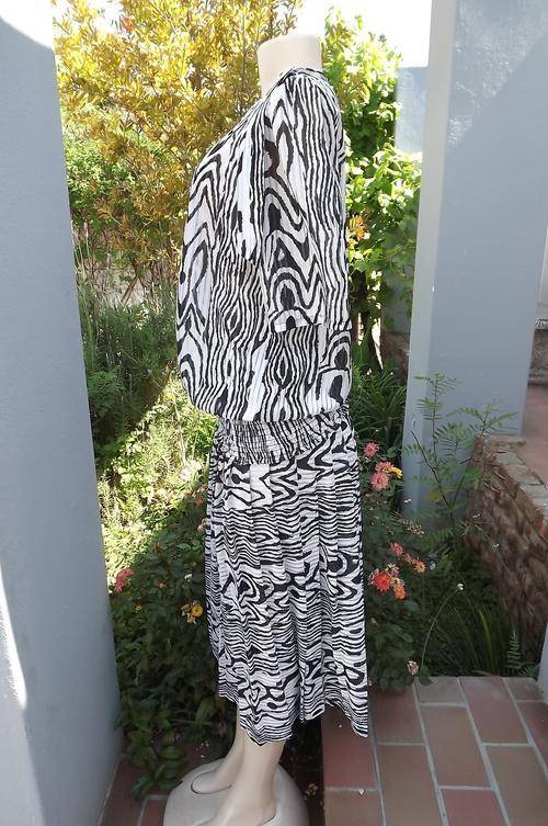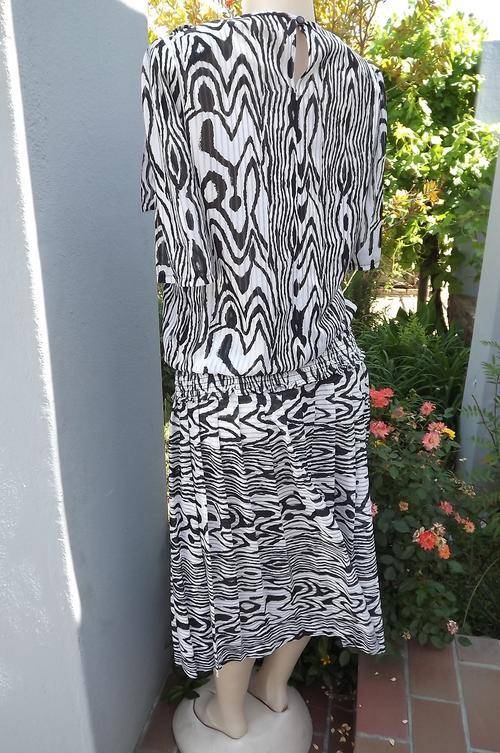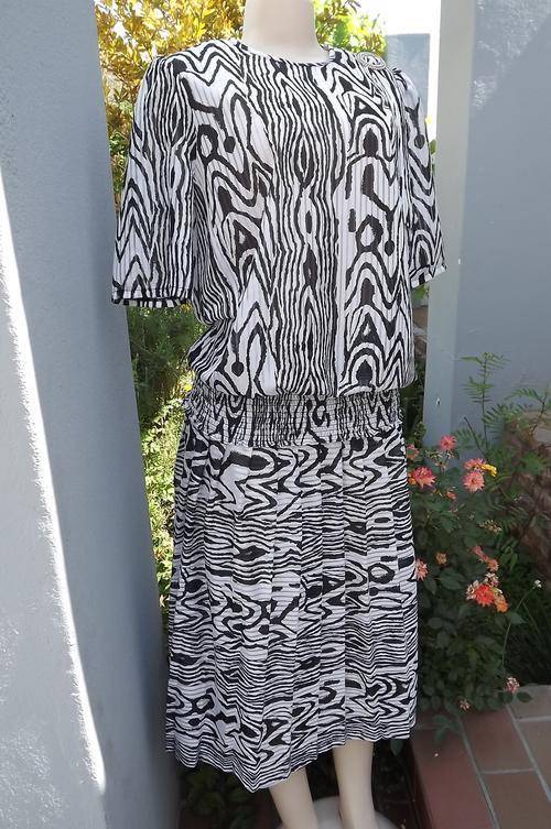 Black & White Animal Print 2 Piece Suit in size 10/34 by Topics - Poly/Rayon Fabric - pleated skirt with elasticated middle - top has wide elasticated seam and pretty buckle with tie on the shoulder - as new condition