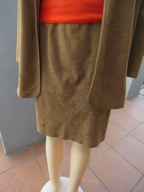 Animal print 3 piece suit in golden brown.Consist of pants,skirt and jacket in size 42/18.By DONNA CLAIRE.In 100% polyester with stretch knee length skirt with zip at side.Long sleeve jacket closing with 2 buttons on front.Used but still in good condition.