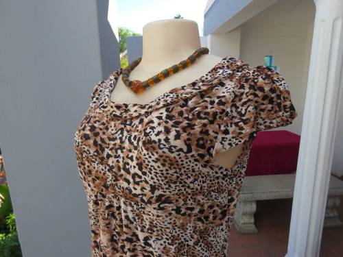 Animal print dress with capped sleeves.Yoked front with gathering.Size 34/10.Soft portret collar