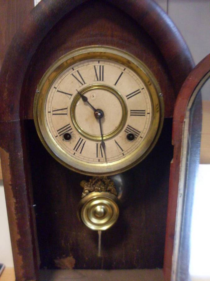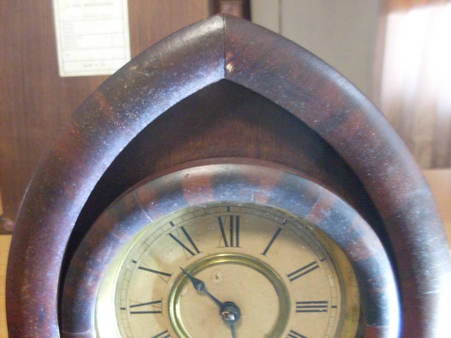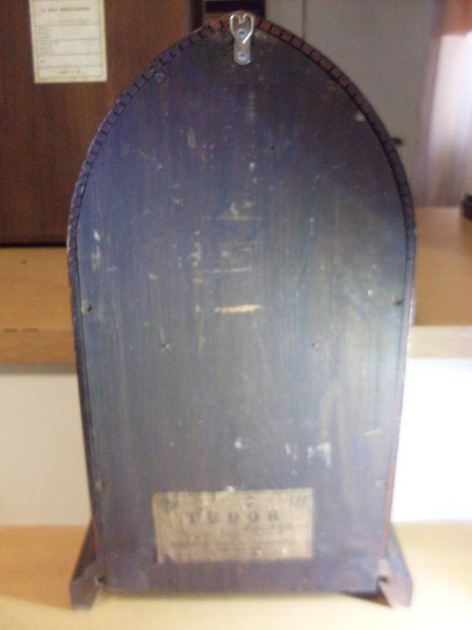 ANSONIA ( TUDOR) MANTLE/WALL CLOCK CIRCA 1892 ...WORKING...133 YEARS OLD HAS ORIGINAL PENDULUM KEY AND STICKER ON DOOR SIZE IS 48 CM X 30 CM X 12 CM PLEASE NOTE ON INSDE OF DOOR FRAME IS A TINY CHIP WHERE DOOR CLICKS CLOSED AND SOME VENEER LOSS