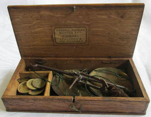 ANTIQUE 1847, CHEMISTS SCALE INCLUDING BRASS WEIGHTS CONTAINED IN AN OAK WOODEN BOX, OVERALL CONDITION VERY GOOD ANTIQUE, ONLY NEEDING ONE OF THE STRINGS TO BE REAJUSTED AS THE BALANCE IS OFF, ALL OF THE WEIGHTS APPEAR TO BE PRESENT. LENGTH OF BOX 14cm, WIDTH OF BOX 7.2cm, DEPTH OF BOX 2.7cm.