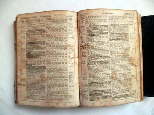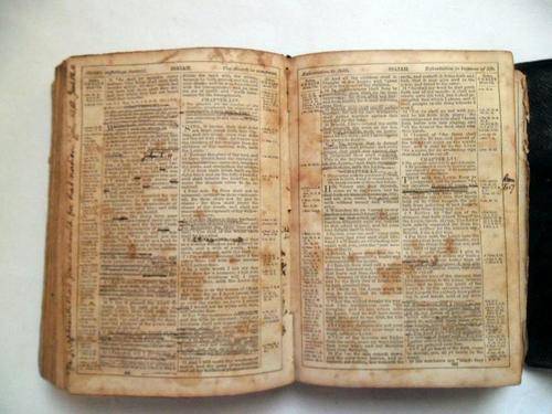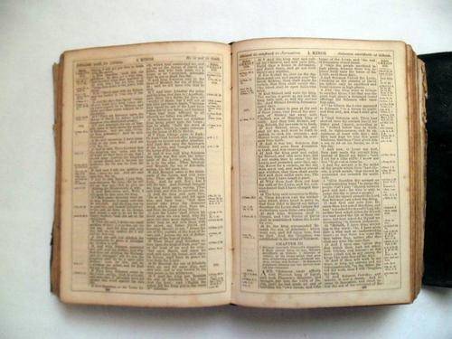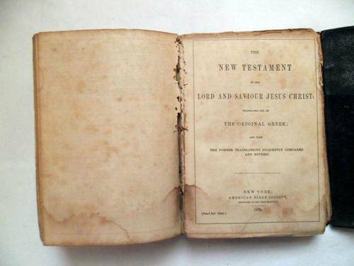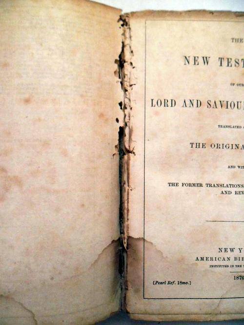 The spine and cover with flap are in very good tight condition. One corner is loosen up and about 20 pages of the New Testament are loose, but none is missing!