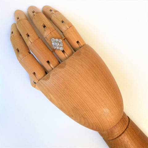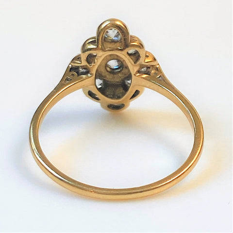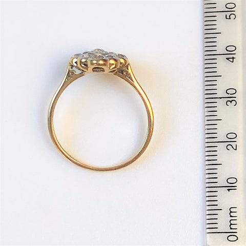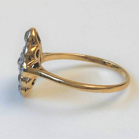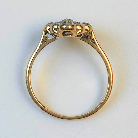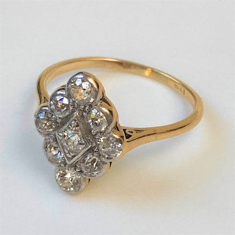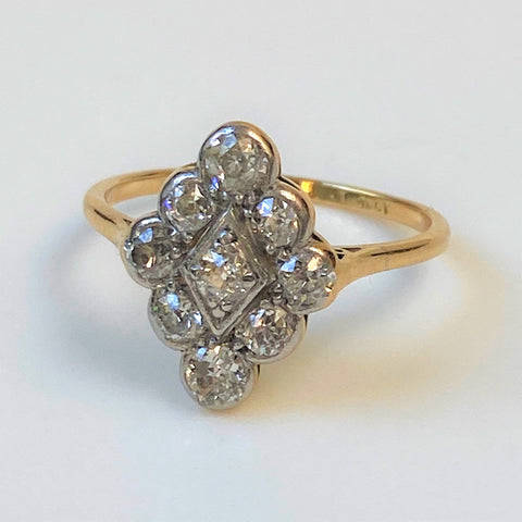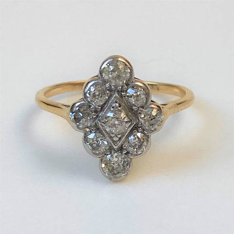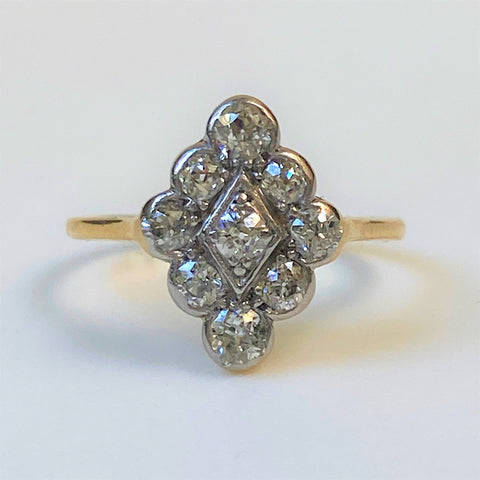 The antique 18ct yellow gold ring has a white gold fronted, diamond-shaped head. It is set with nine round, old-cut diamonds There are two larger diamonds at the top and bottom of the head (circa 0.15ct each). The remaining diamonds are all circa 0.08ct each, making a total of circa 0.86ct of diamonds for the ring. All diamonds circa colour I-J, clarity I3. The ring is marked 18CT, and has another rubbed mark.
