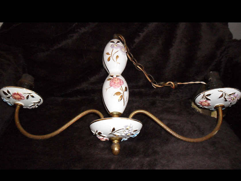 2 ARM BRASS AND PORCELAIN GOLD LEAF CHANDELIER - CHIP ON ONE CUP AS SHOWN IN PHOTOGRAPHS - DIAMETER 50CM X 54CM INCLUDING CHAIN AND BRASS CEILING FITTING - NEEDS A CLEAN - PLEASE VIEW PHOTOGRAPHS - POSTAGE R50