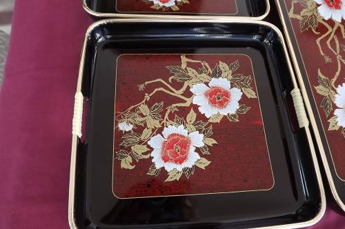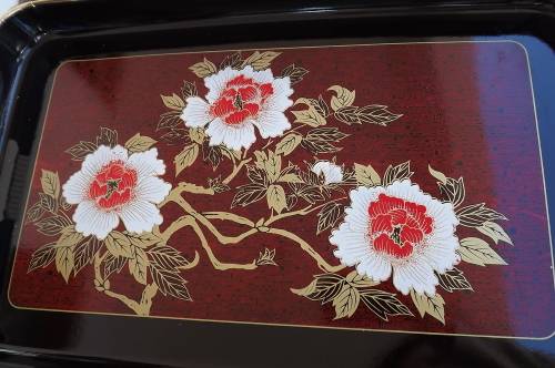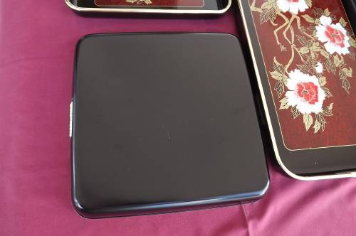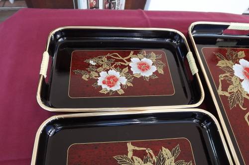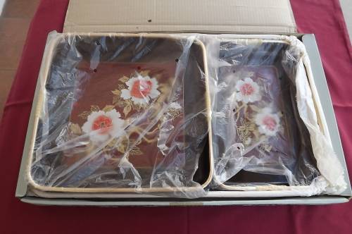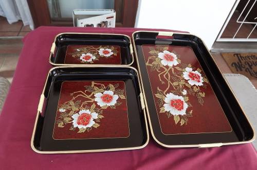 Antique 3 piece nested lacquerware tray set with beautiful floral pattern.Large tray 46 cm x 29.5 cm. 2nd tray 27.5 cm x 27.5 cm .Small tray 28 cm x 18 cm.New item.Still in box