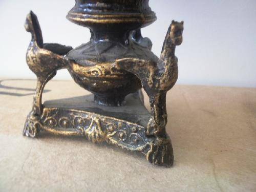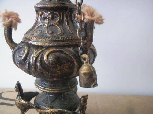 This 20cm tall lamp was made in Greece. Stamped APKAT 221950. It is made of metal with a bronze effect. It has 3 wicks with extra wicks beneath the lid when lifted. It has an attached wick snuffer as well as a pipe cleaner. Very detailed.