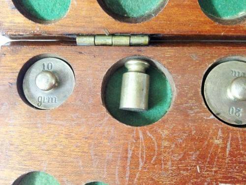WOOD BOX + 11 ASSORTED BRASS WEIGHTS + NOT A MATCHING SET