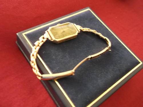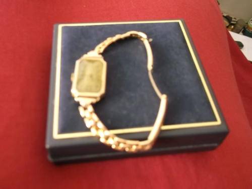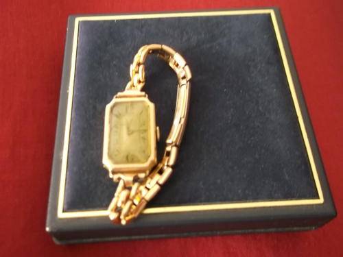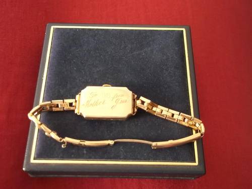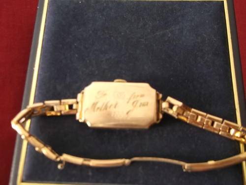 Up for auction is this 9ct gold ladies wrist watch in good working order. It is a wind up and ticks away very nicely, there are no issues only age related wear. It is marked on the back. It has a rolled gold expandable strap which should fit most wrists. It has an inscription on the back " To Mother from Jim. The watch is probably from the 1930s-1940s. Please note payment to be made by Monday after close of auction. Thank you for looking.