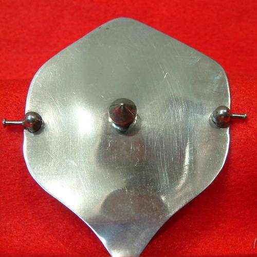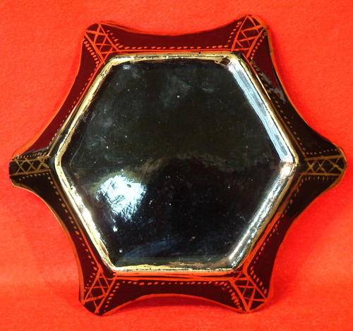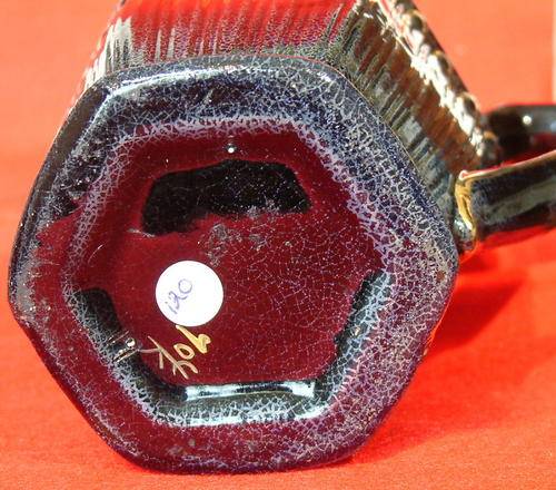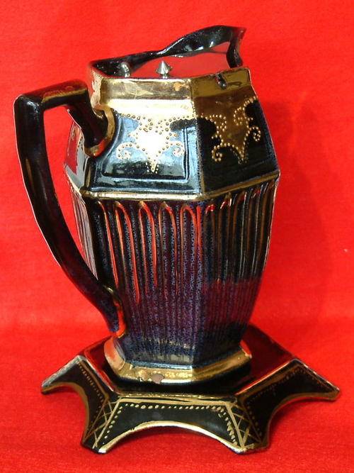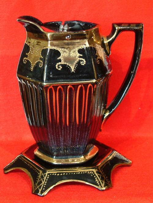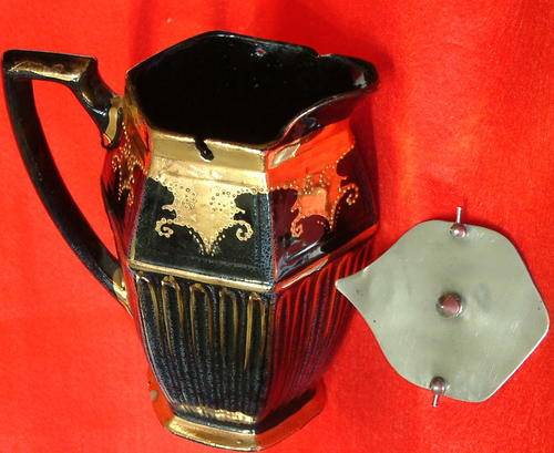 This is a typical'Art Nouveau' styled Coffee Pot, having a black mottled glazing on an earthenware base. The mottled appearance is not evident on the base, so, whether the mottled appearance was intentional, it is hard to decide. Heavily gilded, and having a pewter lid with the maker's name imprinted. (The pewter lid could have been a better fit, in my opinion) . It stands 19cm high to the tip the spout, not including the base it stands on. The diameter of the pot at its widest is 110cm. The base is 2.7cm high with a diameter of 18cm. As to be expected, there is some loss of gilding to the rim and handle. There are two small chips to the base rim of the pot (see photo on left) but no further damage nor cracks.