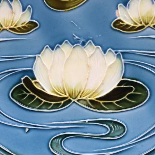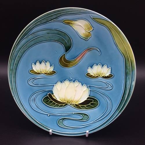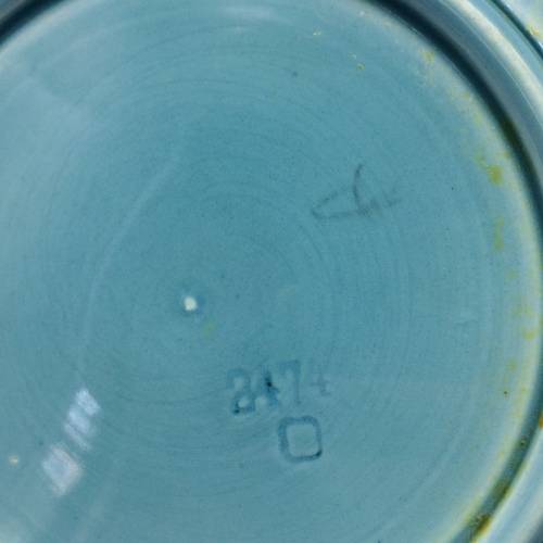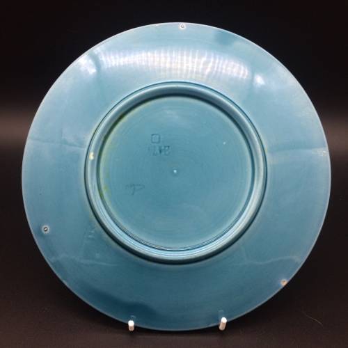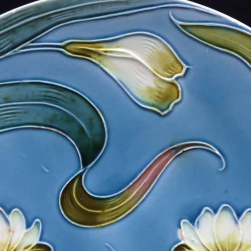 This beautiful Majolica plate is decorated with 3 white water lilies on a blue background in typical Art Nouveau style. According to my research it was made in Germany by 'Georg Schmider Zell Potteries' and dates to the early 1900s. It has the number '2474' impressed on the back and other than a small paint chip on the foot of the plate, it is in excellent condition and the diameter is 19,5 cm.