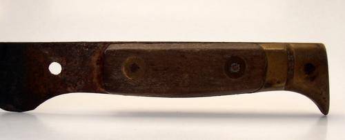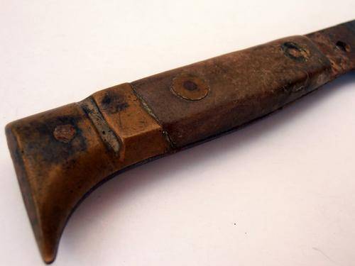 Antique Austrian knife made by Winternitz in Steyr, Austria. The blade has the maker's logo, an archer and "Winternitz-Works, Solinger Slip" and the initials "PG" engraved. The handle is made of wood and it has what looks like a brass butt and rivets. The knife has quite some corrosion from age and a fair bit of rust. Length is approximately 28cm. No cleaning or restoration done, I have left this piece in the condition I found it.