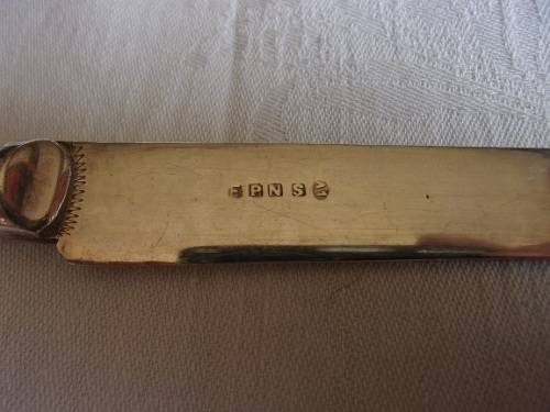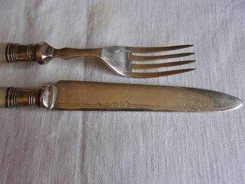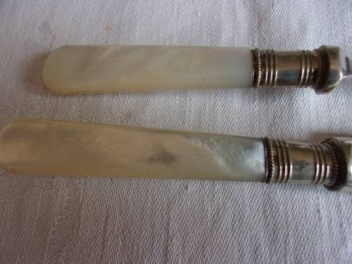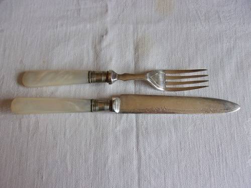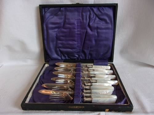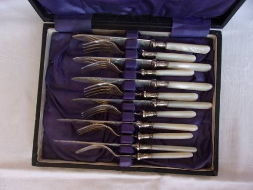 Antique boxed set of 6 EPNS A1 mother of pearl handled fruit/ dessert knives & forks. I would date this lovely set of fruit knives and forks to the early 1900s. The knives and forks have silver plated blades and mother of pearl handles. They are hallmarked A1 EPNS, and come in their original box. They are in very good condition for their age - hardly any wear. The box has some wear. Great buy for your dinner table.