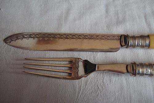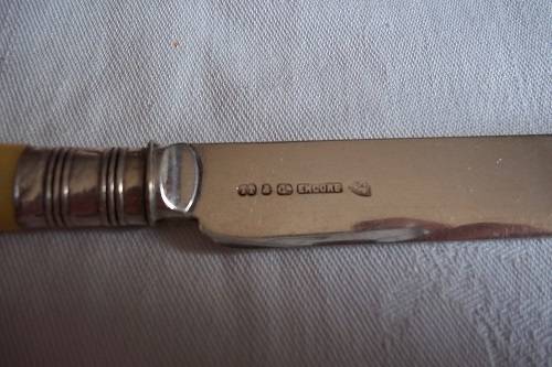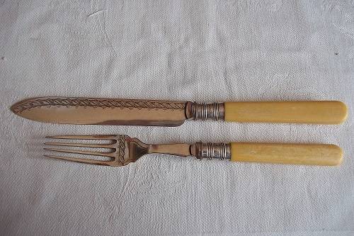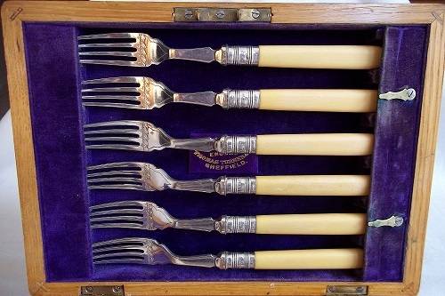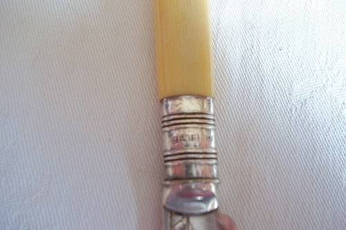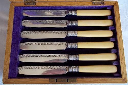Antique boxed set of bone handle Thomas Turner fish knives & forks with Sterling silver collars. This lovely early Edwardian set of 6 fish knives and forks have bone handles, Sterling silver collars and quality silver plated blades. The blades are hallmarked TT & Co, Encore, EP. The collars are hallmarked J.Y (Yates Brothers), crown (Sheffield), lion (Sterling silver) and P (1907). They come in their original oak canteen with the original Thomas Turner logo inside and brass inlay on the outside. They are in very good condition for their age - very little wear to the quality plating. Great buy for your dinner table.