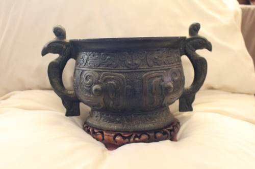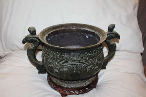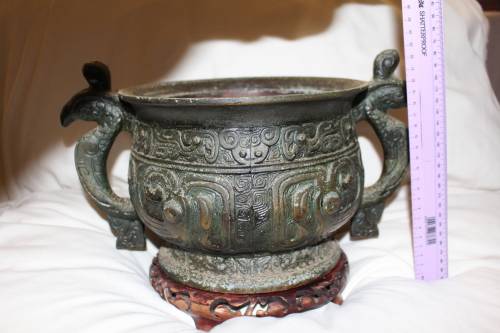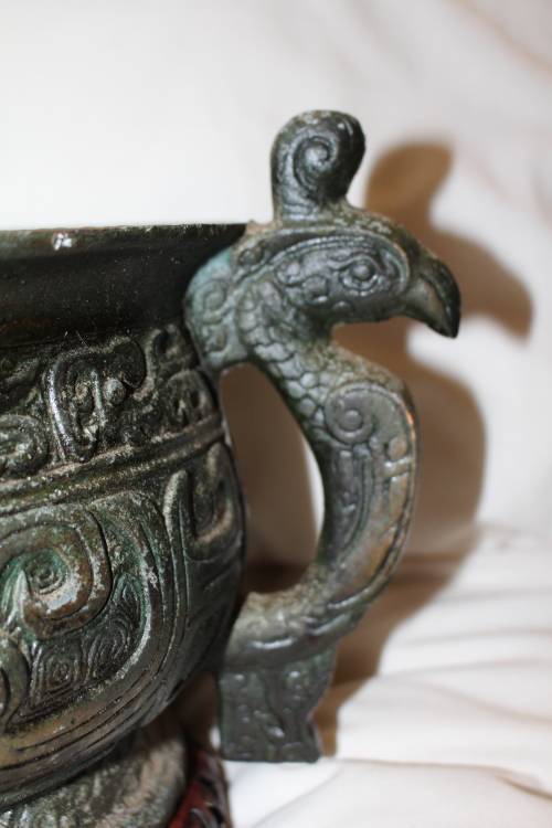 Antique Chinese D'ing Bronze on rosewood stand 36cm wide by 21cm tall