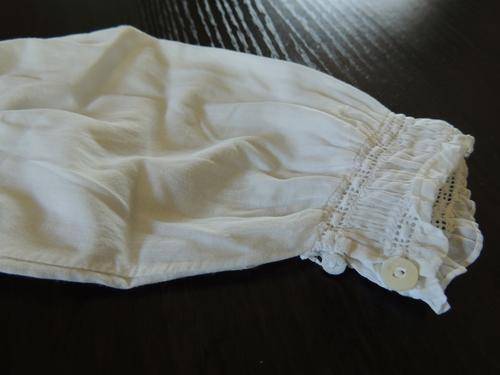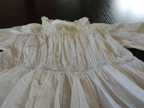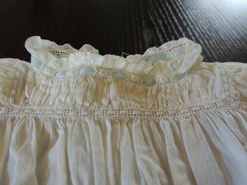 This is a beautiful christening gown with long sleeves and blue ribbon.