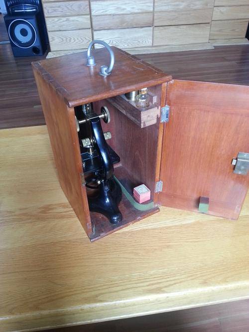 This is quite a rare antique microscope from Europe (London) and was purchased from a little antique shop in Wellington. They told me this was acquired from a Vet from the area who had passed on and the family made it available to them to sell.