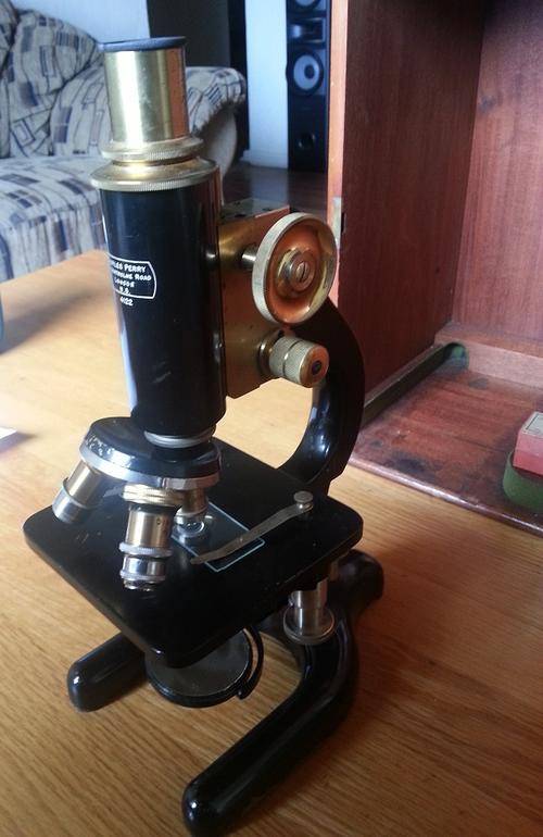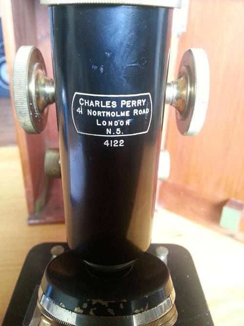 Charles Perry was the foreman of Powell & Lealand who ceased manufacturing microscopes in 1901, after which he went to work for C. Baker of High Holborn and later started up himself as Charles Perry of 41, Northolme Road, Highbury, North London. Whether he had his own factory or had instruments made to his specification by Watsons is unclear.