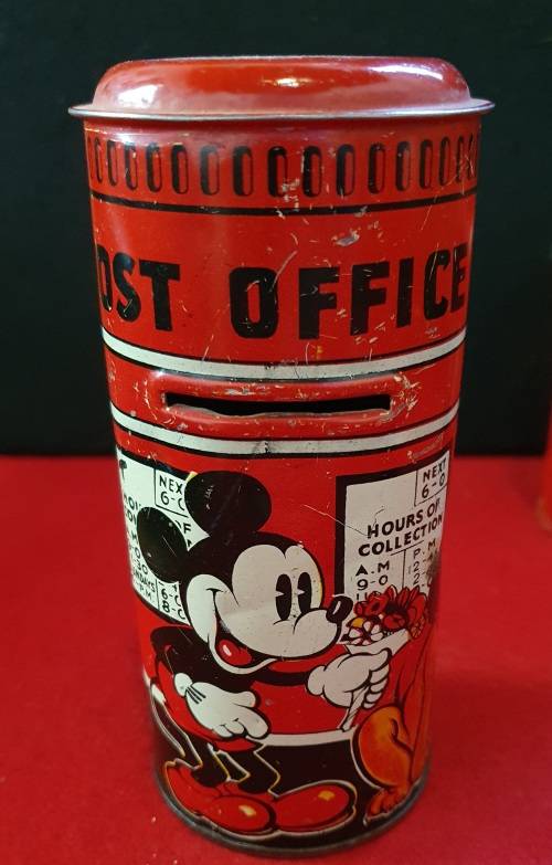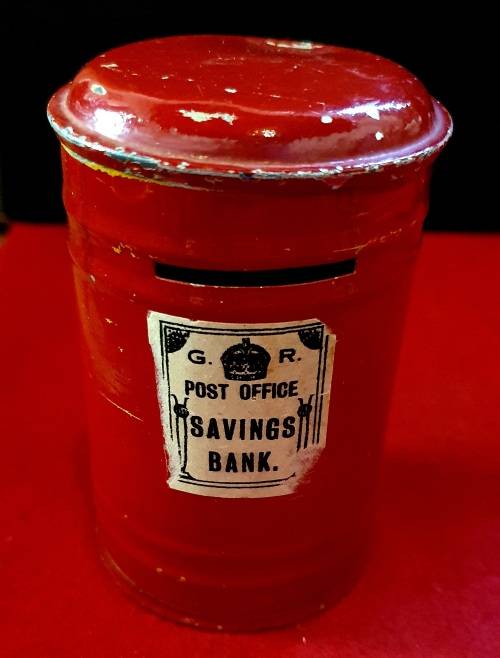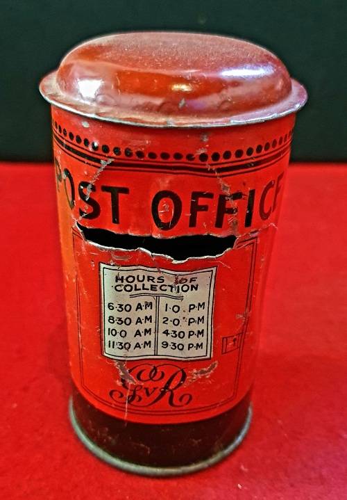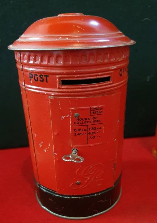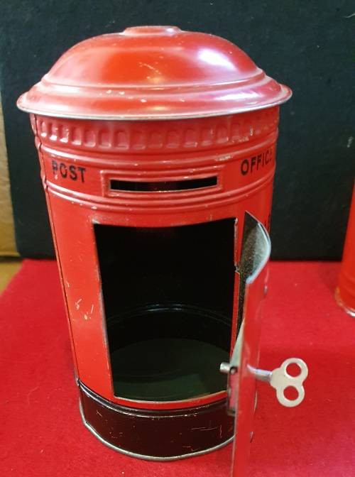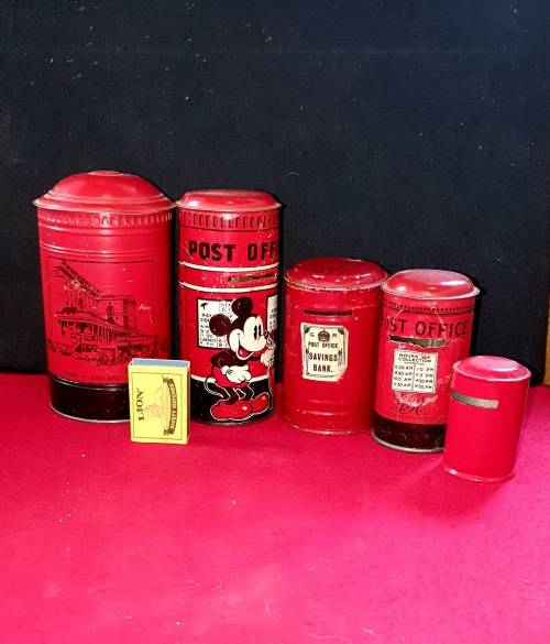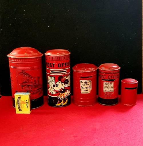 ON AUCTION : ANTIQUE COLLECTION OF 5 X METAL POST BOX MONEY SAVING BOXES !! VERY SCARCE FIND!! SEE PHOTO REPORT FOR CONDITION.