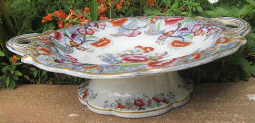 IRONSTONE, VICTORIAN TAZZA BEAUTIFULLY HAND PAINTED IN RICH AUTUMNAL SHADES, HIGHLIGHTED WITH GOLD, SOME OF WHICH HAS WORN IN PLACES. THE TAZZA HAS TWO ORNATE HANDLES, ONE HAVING CHIPS TO THE BACK, YOU CANNOT SEE THEM UNLESS LOOKING FOR DAMAGE. THIS ANTIQUE BEAUTY WILL CERTAINLY BE ADMIRED WHEN IN USE OR ON DISPLAY. HEIGHT 6cm, DIA 22cm..