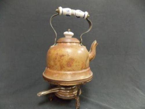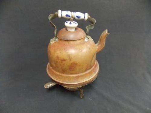 Antique copper kettle. It has a porcelain handle and porcelain knob on the lid. The kettle stands on a tri-pod with a burner. This is a great addition to antique copper collections, or can be displayed on its own. R 40.00 postage fee already added.