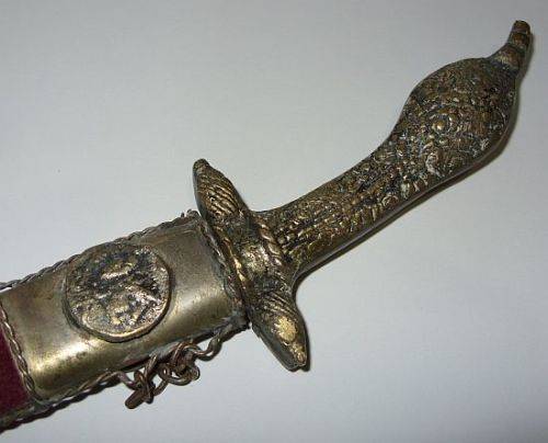 A REALLY ANCIENT LOOKING DAGGER STAMPED 1821 WITH COIN AND SNAKE DECORATION . THE BLADE ALSO HAS OTHER FLORAL ( LEAF ) TYPE DECORATIONS . I AM NOT 100 % SURE BUT IT LOOKS PERSIAN IN ORIGIN , POSSIBLY CEREMONIAL .CONDITION AS PER PICS , BLADE IS NOT LOOSE .