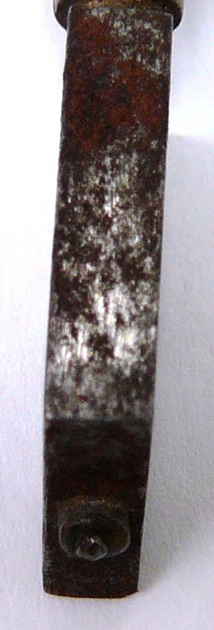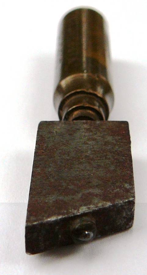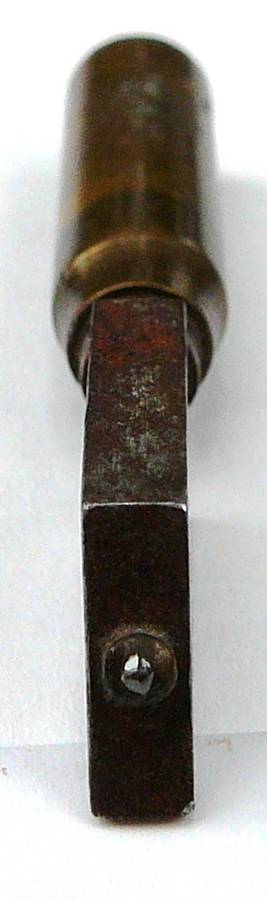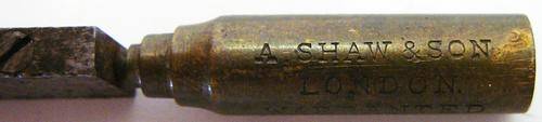 The Handle which was probably made of Rosewood is missing from this glass cutter. The brass mount is stamped A.SHAW & SON.LONDON. The top of the diamond holder is stamped 'B' It is 62 mm long and weighs 20 grams.